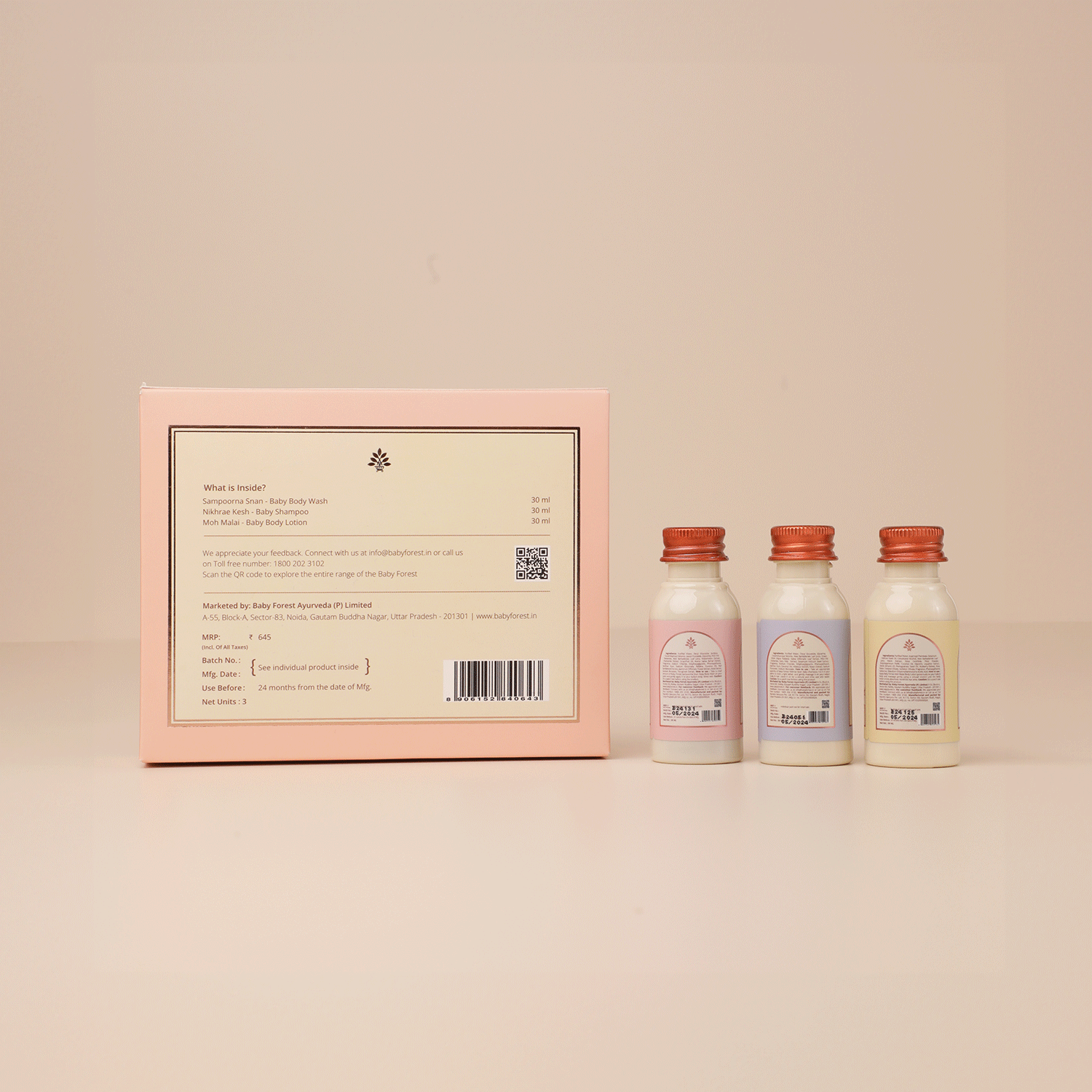A curated collection of baby bath ritual products with crafted formulations, inspired by Ayurveda. The ultra-luxe kit contains Sampoorna Snan baby body wash, Moh Malai baby body lotion, and Nikhrae Kesh baby shampoo, making it the ultimate kit for keeping your baby’s well-being in check while traveling.
