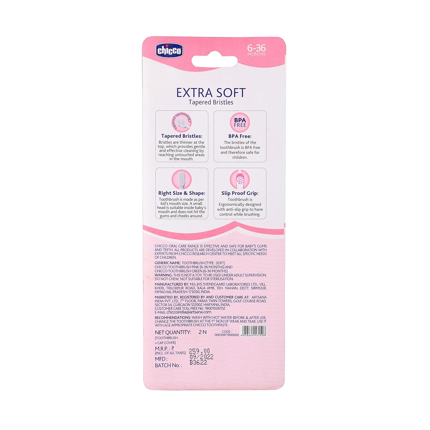 Chicco Toothbrush Set (Pink + Green) is specially designed for babies and toddlers aged 6 to 36 months. With soft tapered bristles and an ergonomic handle, these toothbrushes ensure gentle and effective cleaning of little teeth and gums. The fun colors make brushing an enjoyable routine for children.