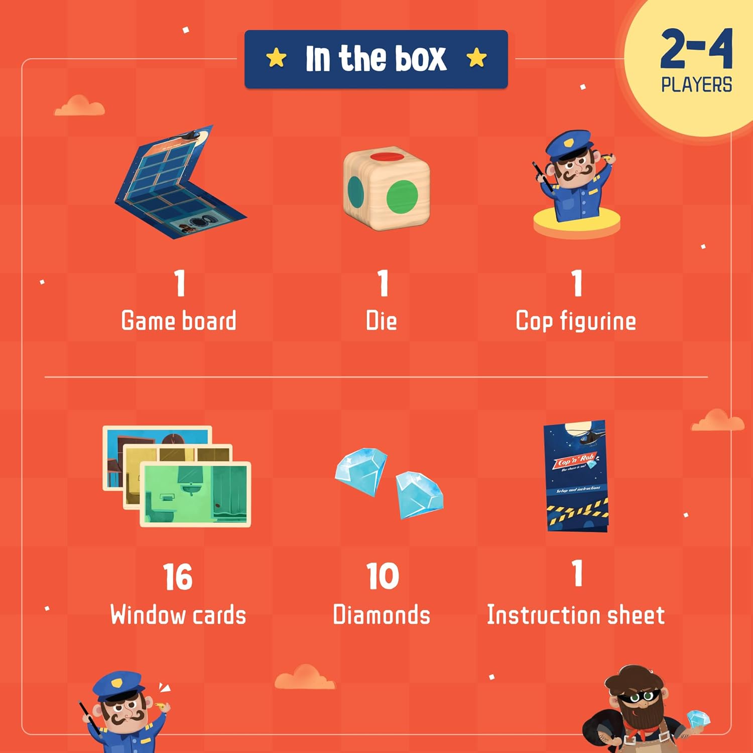 IN THE BOX - 1 Game board, 16 Window cards, 1 Cop figurine, 10 Diamonds, 1 Die, 1 Instruction sheet.