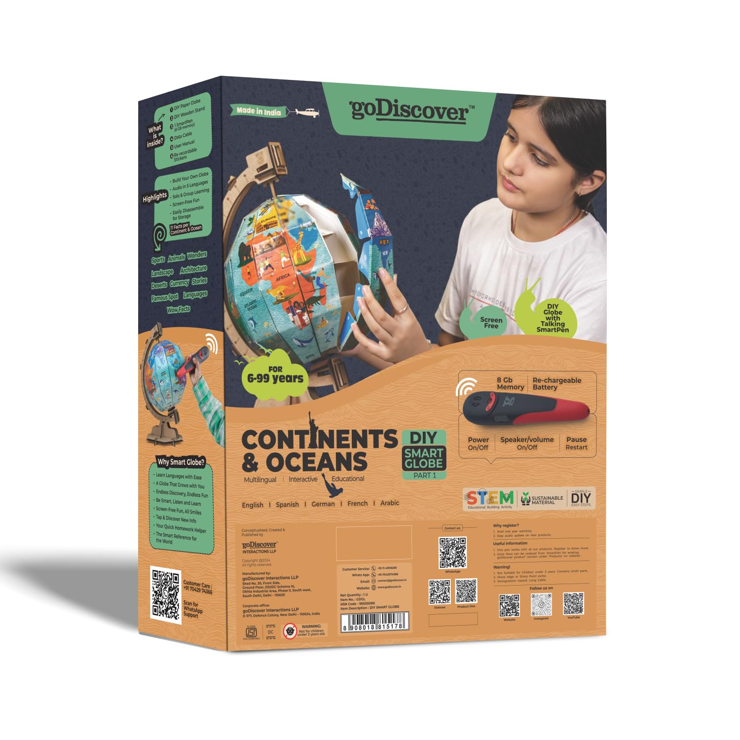 Explore the world in a fun and interactive way with the goDiscover Interactive Globe with Smart Talking Pen! This DIY educational globe helps children learn about continents, countries, and oceans while listening to facts in English, Spanish, French, German, and Arabic. The smart talking pen brings geography to life with engaging audio, helping kids improve their language skills and global knowledge through play. A perfect learning companion that makes geography exciting and hands-on for curious young minds.