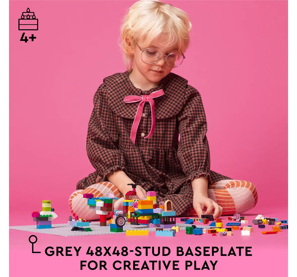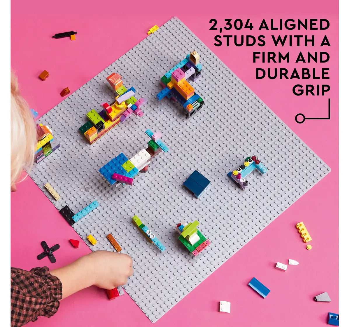 Lay the foundations for open-ended creative play with the LEGO Classic Gray Baseplate (11024). Measuring over 14.5 in. (38cm) square, this high-quality building toy gives kids a spacious 48x48-stud LEGO landscape on which to build, play and display. Made for imaginative play Inspire LEGO builders with an endless array of building possibilities from street scenes to castles and mountain landscapes. This quality baseplate has enough grip to hold LEGO building bricks at any angle, even upside down! And when the building stops, the firm grip gives kids a collapse-free way to transport and display their creations. Building key life skills LEGO Classic sets put self-expression and open-ended play into kids hands. And as they construct, create and imagine, their free-thinking and problem-solving skills keep on growing!