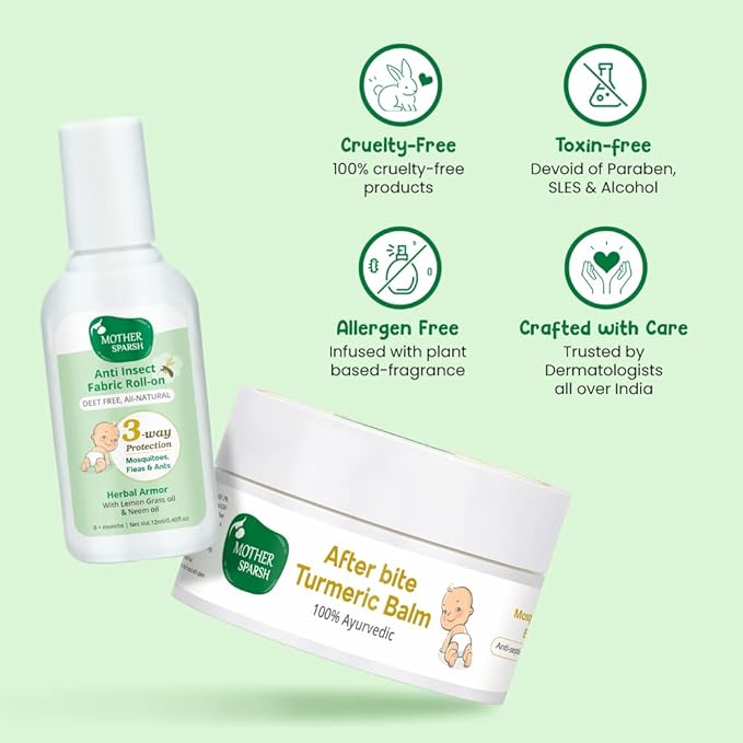 - 🎈 AYURVEDIC FORMULATION: The formulation of Mother Sparsh Turmeric After Bite Balm has an Ayurvedic formulation curated specially for a baby's sensitive skin. The remedy consists of a blend of essential oils like Jaitoon & Sarson that fights off minor infection & itchy skin caused by mosquito or insect bites whereas Turmeric helps heal the irritated skin. Mother Sparsh Turmeric Balm is suitable for all skin types & safe for your little one.