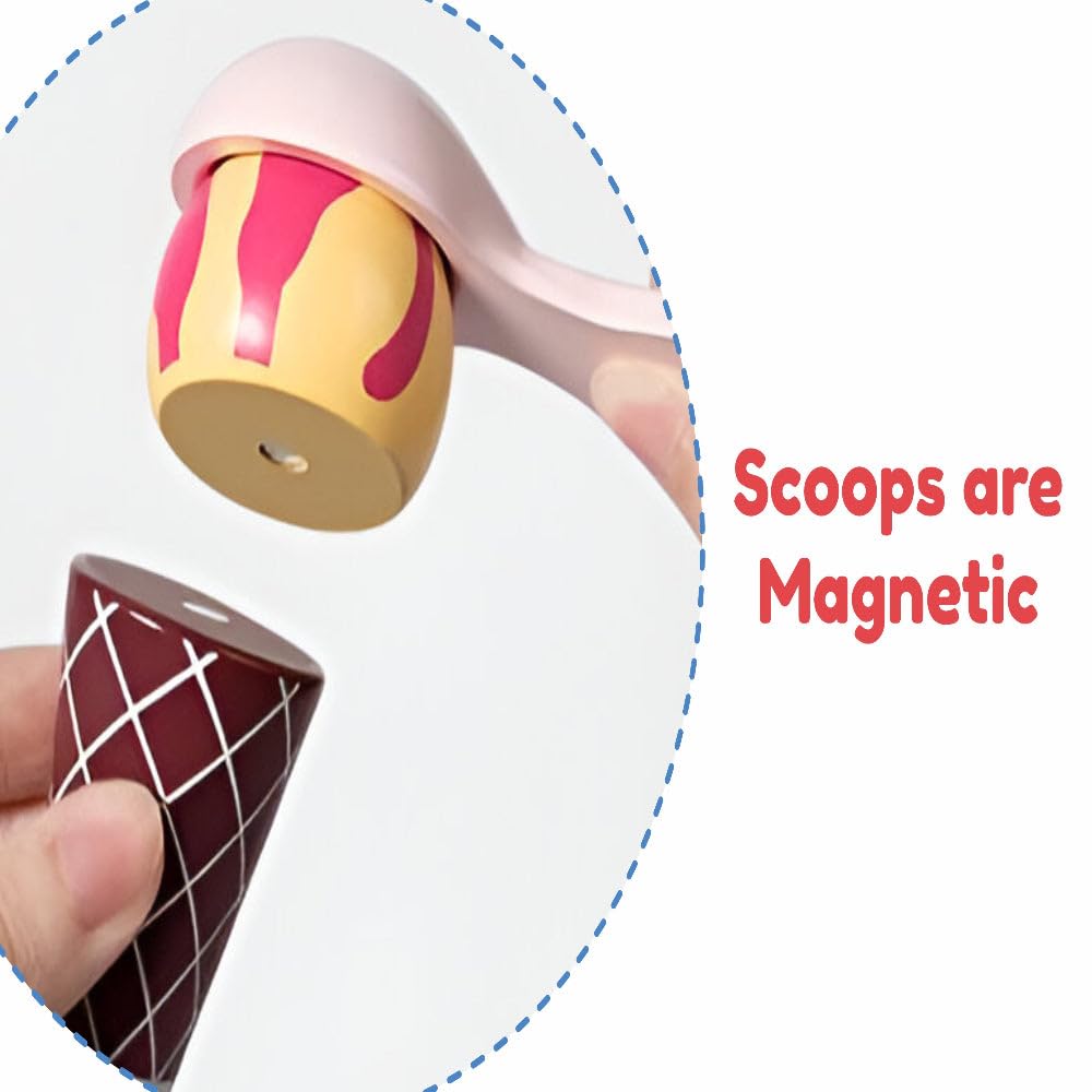 Scoops are Magnetic for enhanced play. Kids love scooping the ice cream and doing different colors/flavor combos.