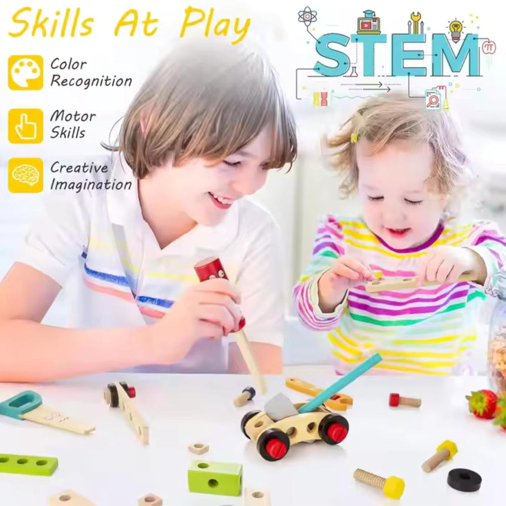 - 🎈 35-piece Tool Kit: The wooden tool kit designed especially for kids includes 1×Wooden Tool Box,1xPhillips Screwdriver, 1XSaw, 1X Hammer, 9 xComposite Plate, 2x Phillips Screw, 2x one Piece Screw, 2x Hexagonal Screw, 1x Flat-head Screwdriver, 1xWrench, 1x Ruler, ,4x Nuts,1xHexagonal Wrench, 1x Linesman Pillers, 1xModular Building Block, 2xBuilding Block, & 4x Wheels.