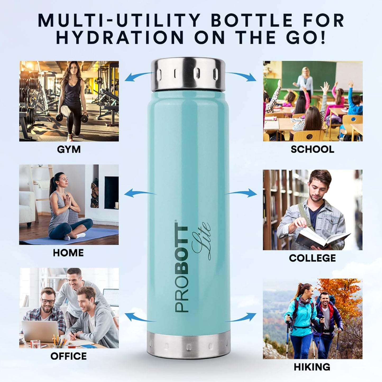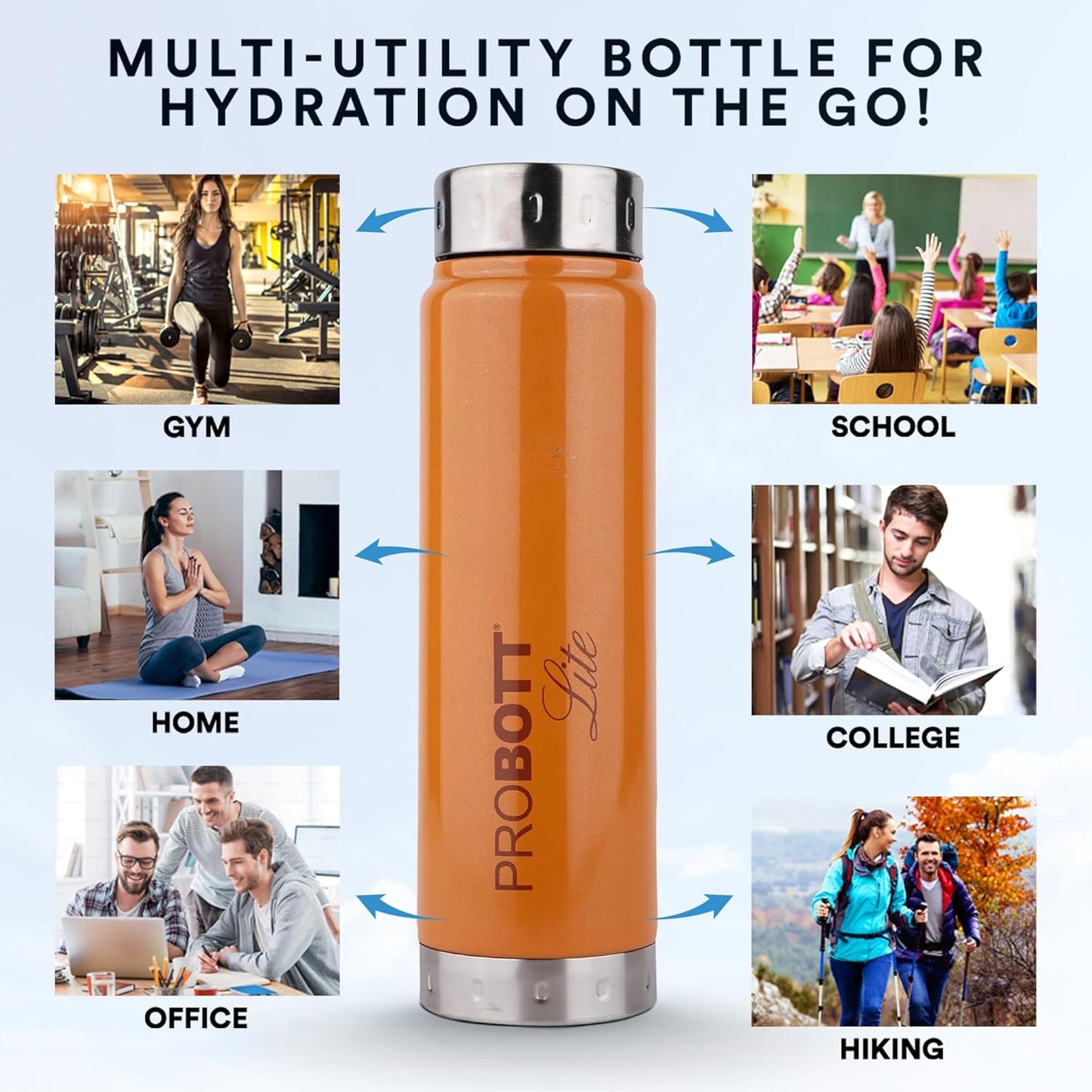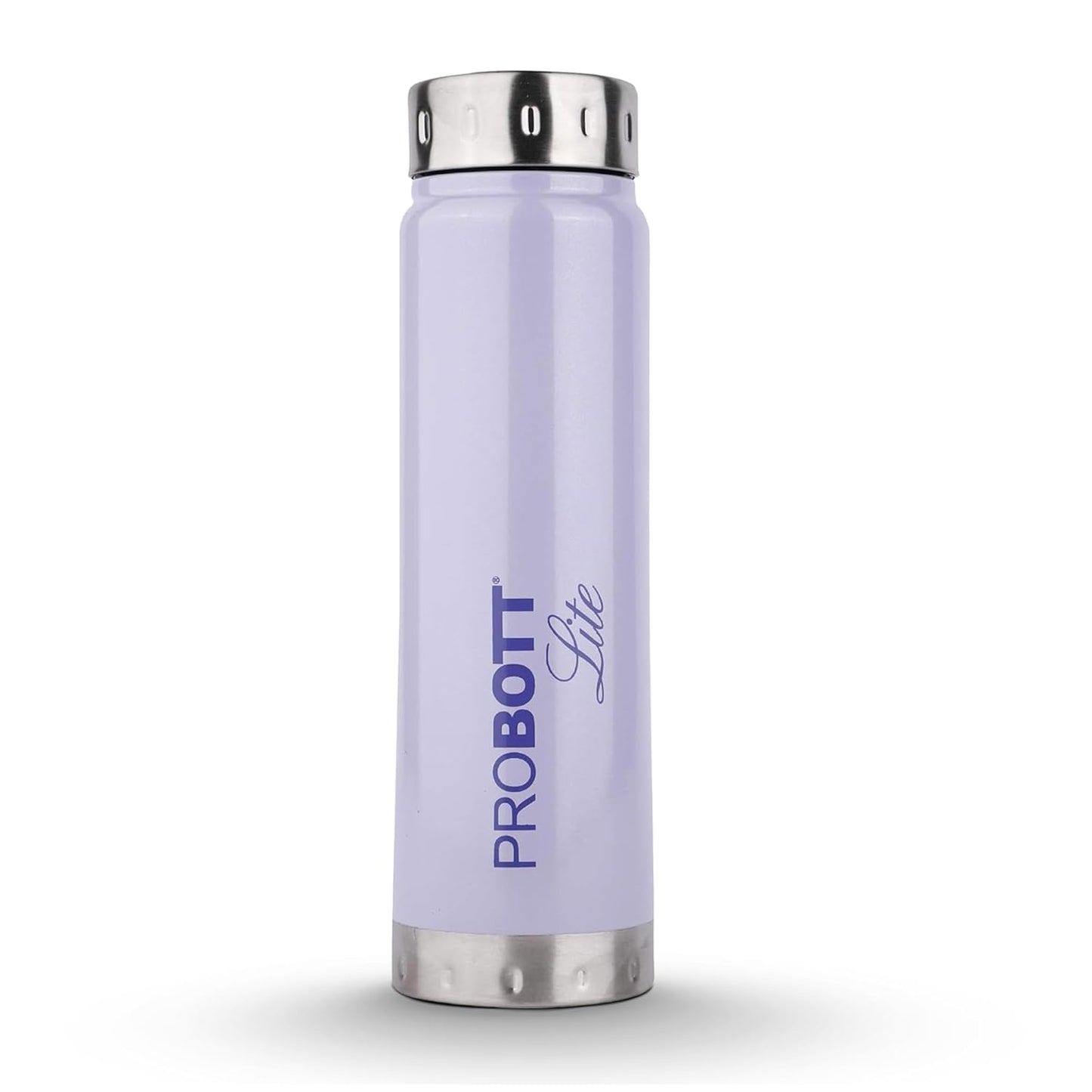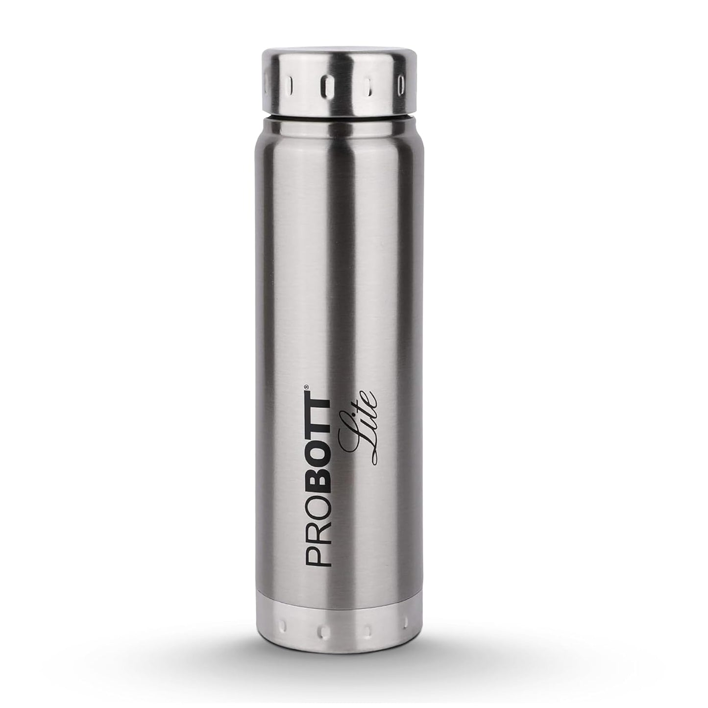 PROBOTT LITE, is one of the leading brands. Probott lite Bottles feature Single wall stainless steel bottle,BPA Free,Inbreakable stainless steel construction,made from high quility stainless steel,hygienic push button sip through lid with locking mechanism,Inner stainless steel body permits eaasy cleaning & maintains Hygienic,Speacial design lid eliminate leakage issues & gives a leak proof stylish product.Carry your protein shake, juices and soups in the bottle while you go hiking and camping. You can simply unscrew the lid to refill the bottle. Access the sipper by lifting the cap. The stylish exterior and color combination makes this bottle a must have.