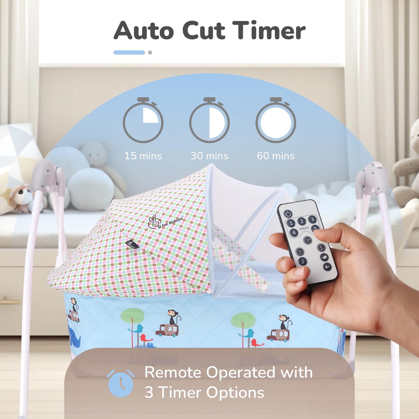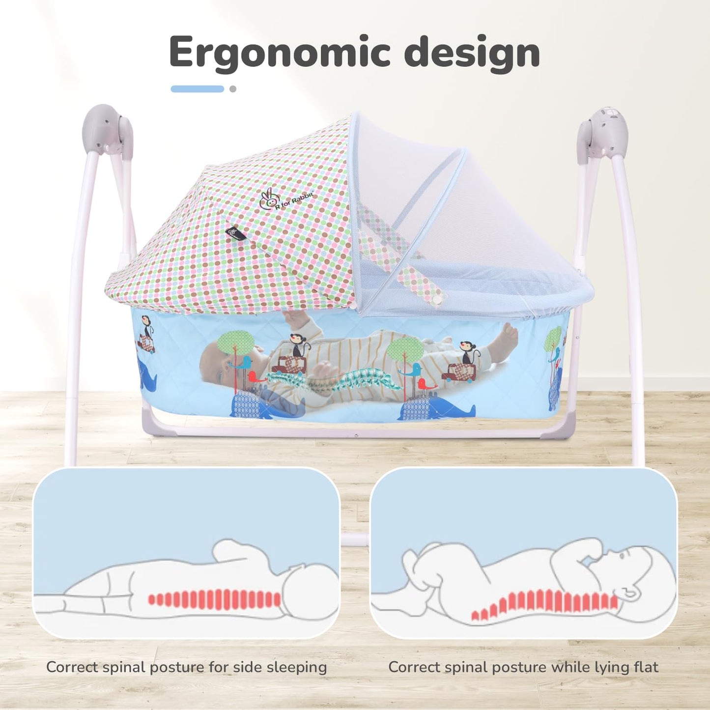 The R for Rabbit Fabric Baby Cradle is designed to give your little one a safe, cozy, and soothing sleep environment. With its automatic swing function, remote control, and built-in soothing music, it ensures comfort and convenience for both baby and parents. The cradle comes with a mosquito net for protection, an extra-cushioned seat for comfort, and a 5-point safety harness to keep your baby secure.