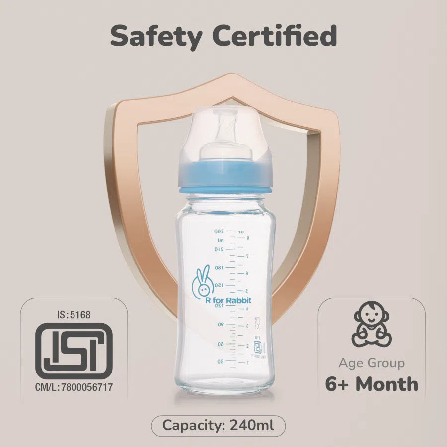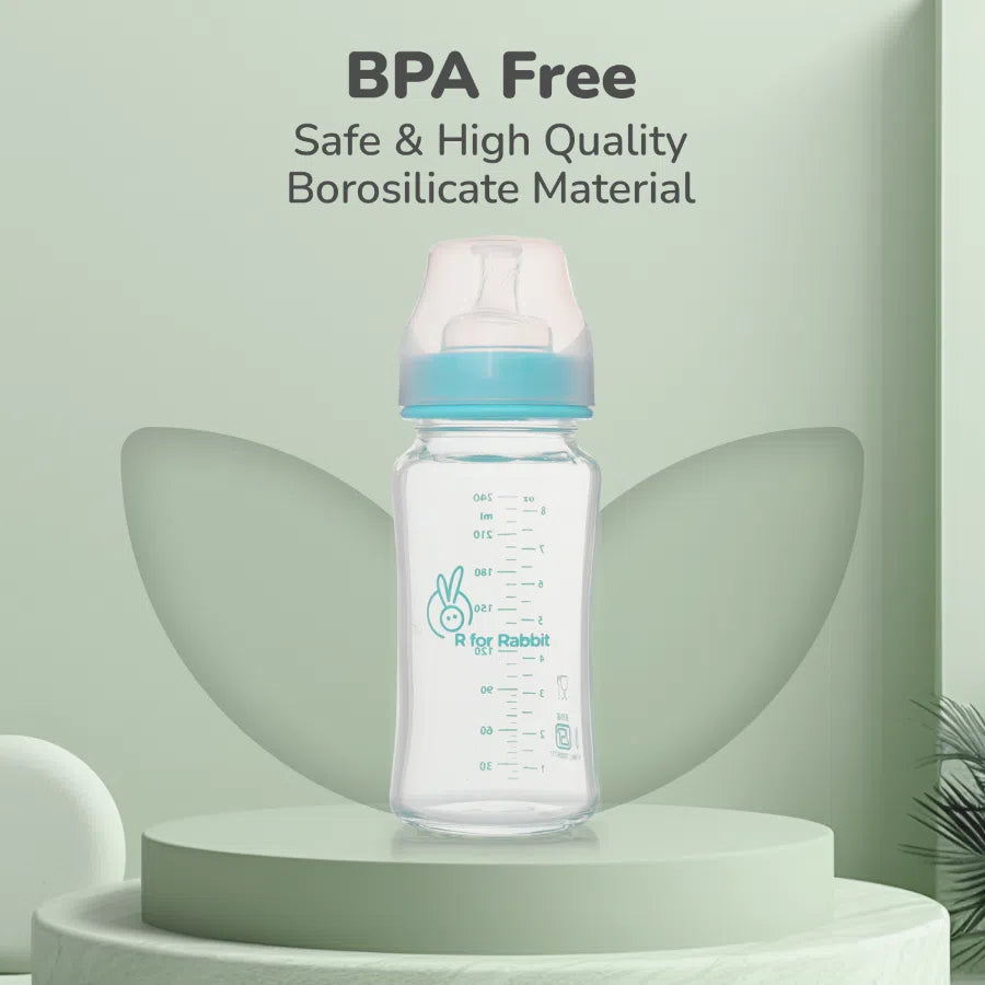 R for Rabbit First Feed Glass Feeding Bottle 240ml is designed to provide a safe, comfortable, and natural feeding experience for your baby. Crafted from premium borosilicate glass, it offers superior heat resistance and durability. The soft silicone nipple closely mimics natural breastfeeding, helping babies transition easily between breast and bottle. Its anti-colic vent system minimizes air intake to prevent gas and discomfort during feeding. With its BPA-free, non-toxic construction and elegant design, this bottle ensures safe, healthy, and joyful feeding sessions every time.