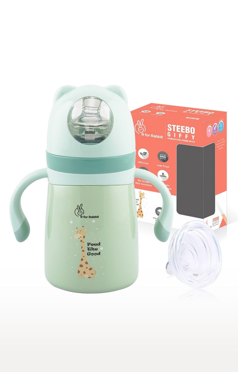 R for Rabbit Steebo Giffy Spout Cup 300ml is the perfect blend of safety, style, and functionality for your little one’s drinking needs. Made from premium food-grade stainless steel, this cup is BPA-free, durable, and hygienic for everyday use. The soft silicone spout is gentle on gums, helping babies transition smoothly from bottles to cups. Its double-wall insulation keeps liquids warm or cool for longer durations, while the leak-proof lid ensures spill-free use during travel or play. With an easy-grip design and adorable colors, the Steebo Giffy Spout Cup makes drinking fun and comfortable for kids.