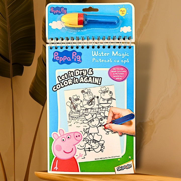 Make learning and playtime magical with the Skoodle Peppa Pig Premium Water Magic Book! This delightful activity book comes with charming Peppa Pig-themed scenes that kids can bring to life using just water and the included easy-to-hold brush pen. Once dry, the colors fade, allowing endless reuse without any mess. Perfect for developing creativity, motor skills, and focus, this mess-free activity book is ideal for travel, playdates, or at-home fun. A wonderful way to keep kids engaged while they explore their imagination — with Peppa Pig by their side!