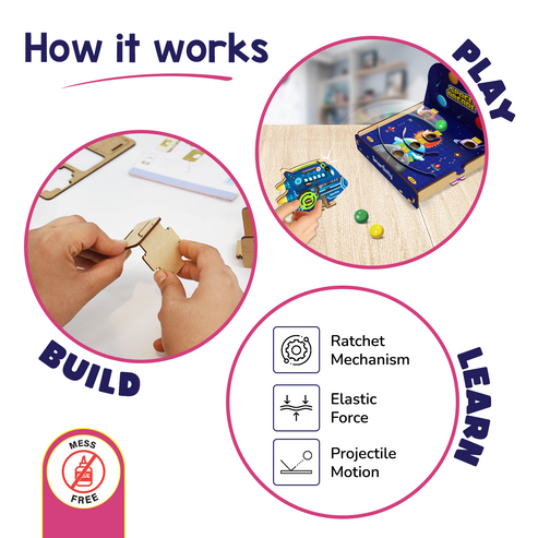 Step into the exciting world of arcade gaming with this kit! Your child will build a Spacecraft Launcher and a Points Zone. They will load 5 balls into the Shooter, aim it at the Points Zone, and try to score points by hitting at different holes. After playtime, they will open the Points Zone lid to tally their score. The kit includes two sets of different colored balls for a 2-player game. With easy-to-follow instructions and explanations of STEM concepts, this game is sure to become a favorite among family and friends!