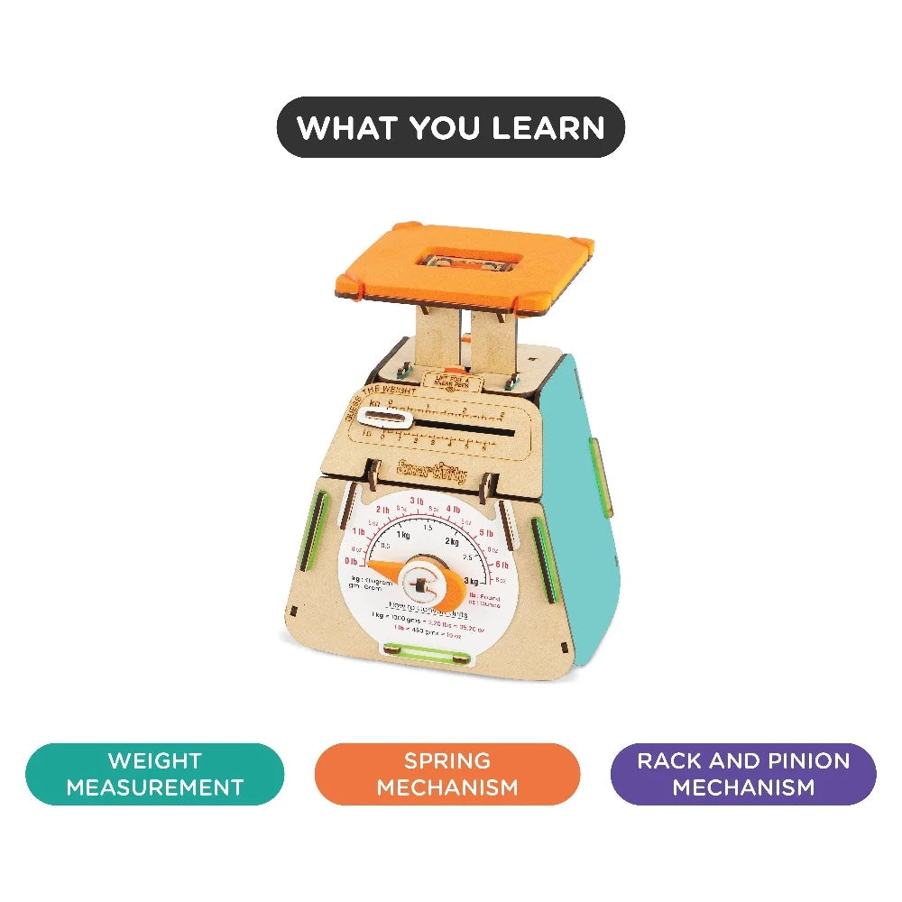 The Smartivity Weighing Machine is a STEM educational DIY fun toy that helps children learn the concept of weight and measurement through hands-on construction and play. This interactive activity kit allows kids to build their own functional weighing machine and accurately measure objects ranging from 250 grams to 3 kilograms.